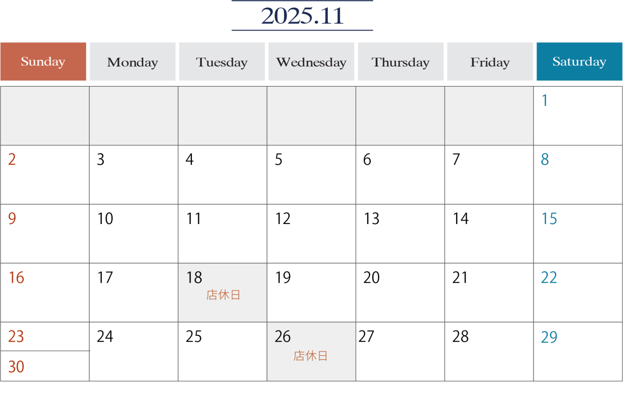 10月~11月中は下記の日にちを店休日とさせていただきます。